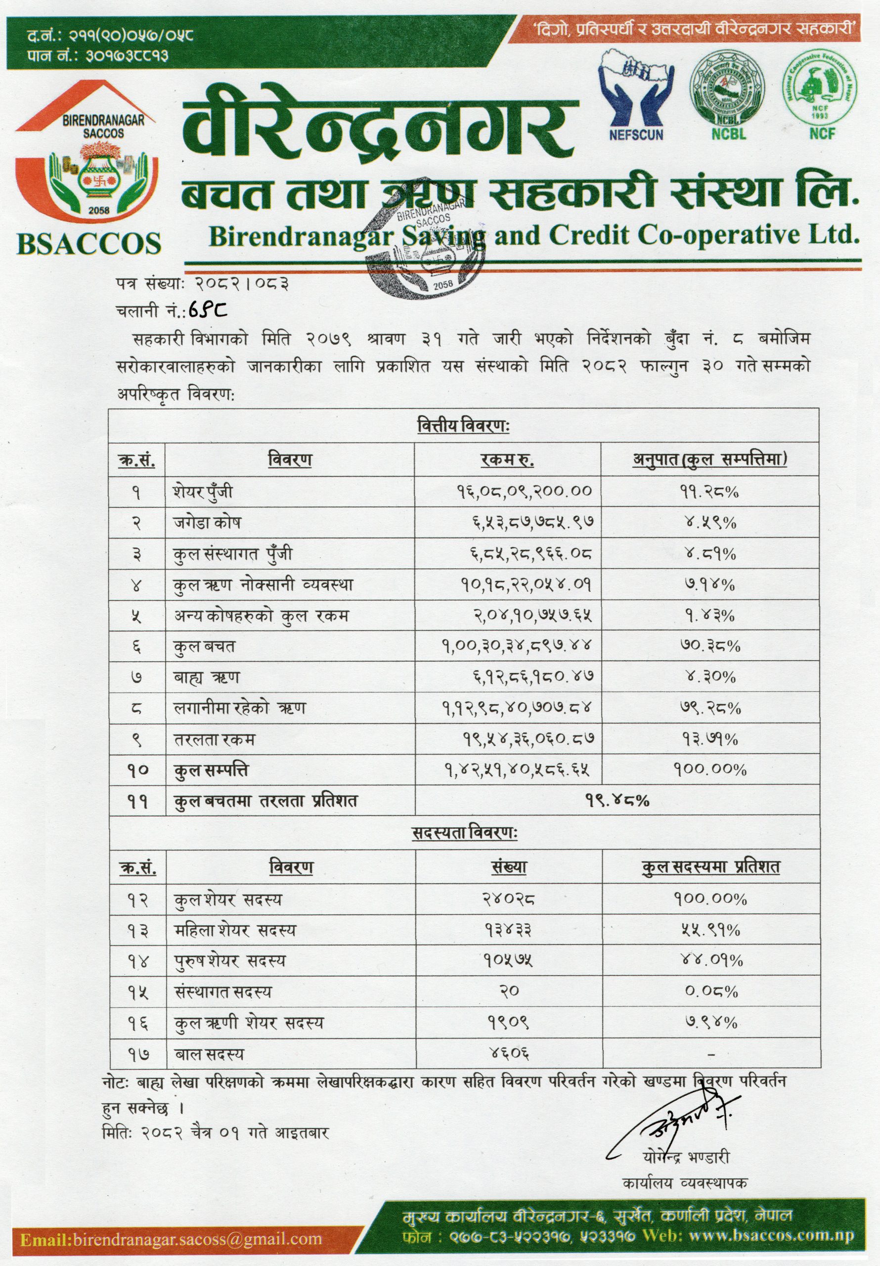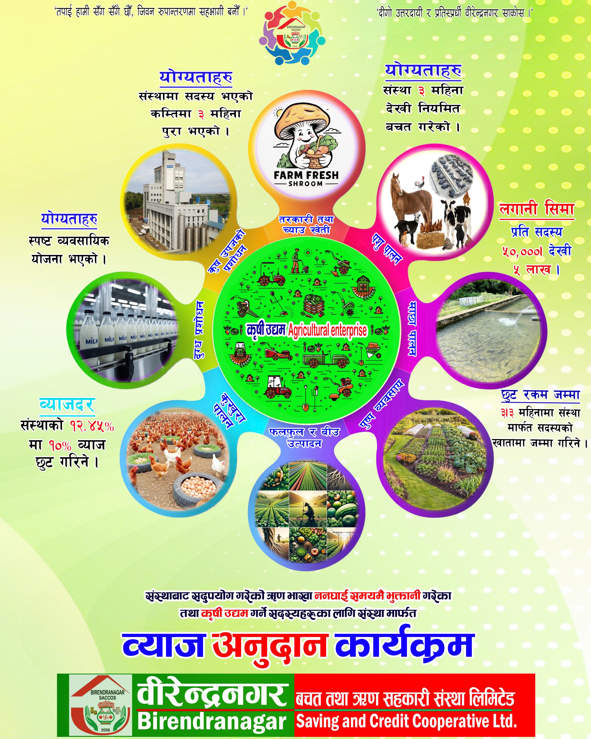 वीरेन्द्रनगर नगरपालिका. वडा नं. ९, सुर्खेत । म लगायत मेरो समुहका महिला दिदिबहिनीहरुले यस साकोसबाट यूवा स्वराेजगार ऋण अन्तरगत सहुलियतपूर्ण ऋण लिई बेराेजगार दिदिबहिनीहरुले आर्थिक उपार्जनका लागी ब्यवसायिक रुपमा आफर हाेमस्टे सञ्चालमा ल्याएकाछौँ । जसले गर्दा हाम्राे समुहका दिदिबहिनिकाे आयस्तर बढ्नुका साथै जीवनस्तरमा परिवर्तन आएकाे छ ।